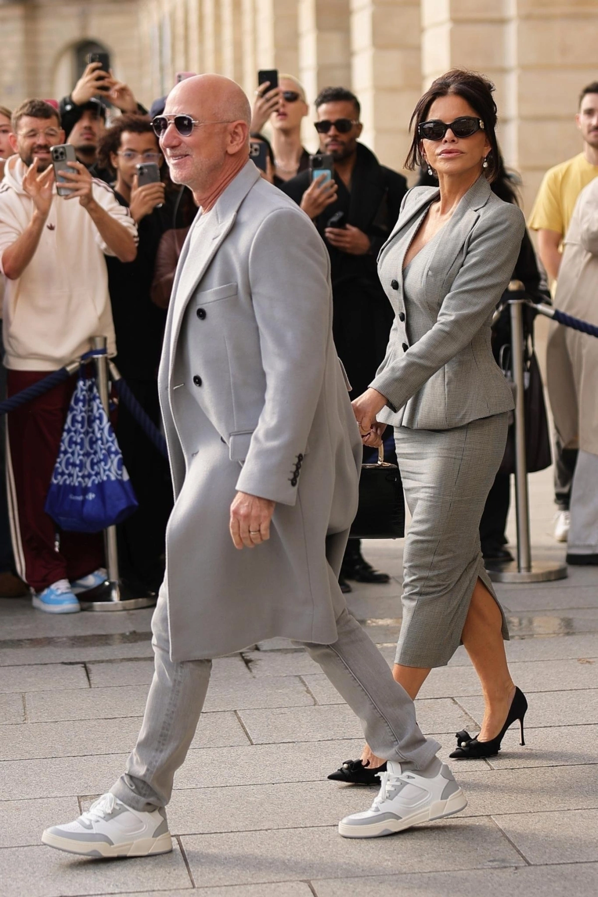 Trước đó một ngày, vợ chồng tỷ phú Jeff Bezos xuất hiện trên đường phố Paris trong hai bộ đồ màu xám. Sanchez diện áo peplum và váy suit vintage của John Galliano thuộc bộ sưu tập Xuân Hè 1995. Nhà sáng lập Amazon mặc tông xuyệt tông với vợ. Ảnh: Backgrid