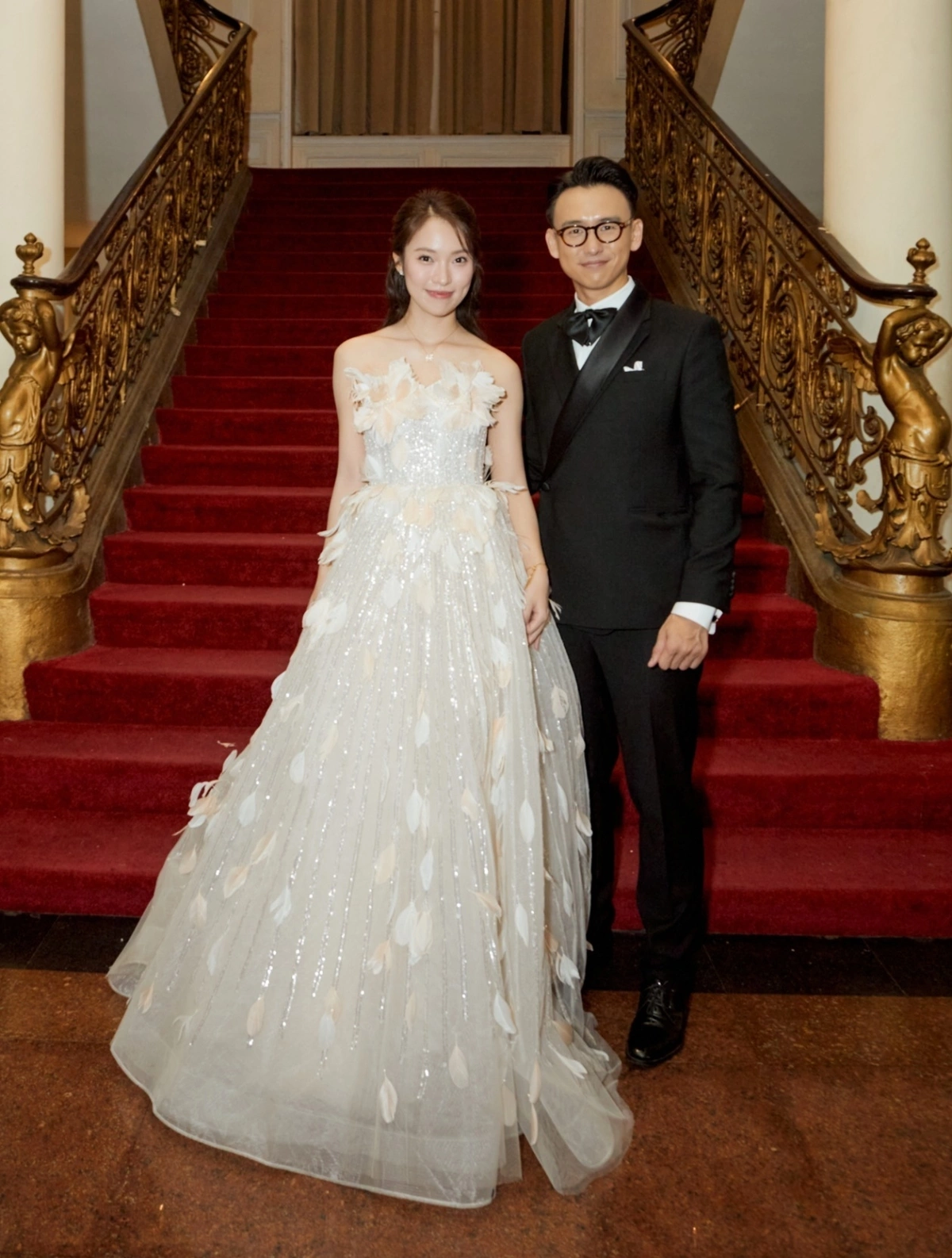 Khánh Vy dùng đầm cưới làm trang phục dẫn chương trình. Bộ váy quây ngực dáng công chúa nhấn bằng chi tiết lông vũ, pha lê và sequin.