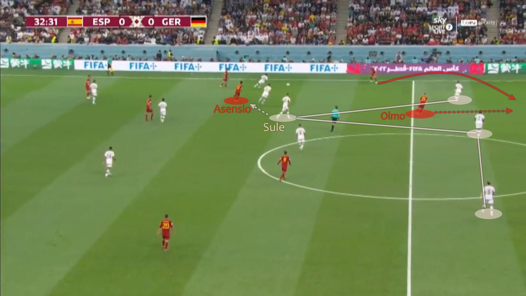 Trong hơn 10 phút cuối hiệp 1, Tây Ban Nha đã hai lần đưa quả bóng trực diện ra sau lưng hàng thủ của Đức, xuất phát từ chính việc trung vệ của Đức (cụ thể là Niklas Sule) đẩy lên dập tiền đạo lùi về nhận bóng của Tây Ban Nha (tức Marco Asensio). Ở cả hai pha bóng ấy, luôn là Dani Olmo dạt từ biên trái vào trong, đúng chỗ Asensio để lại, trước khi đâm ra phía sau hàng thủ của Đức.