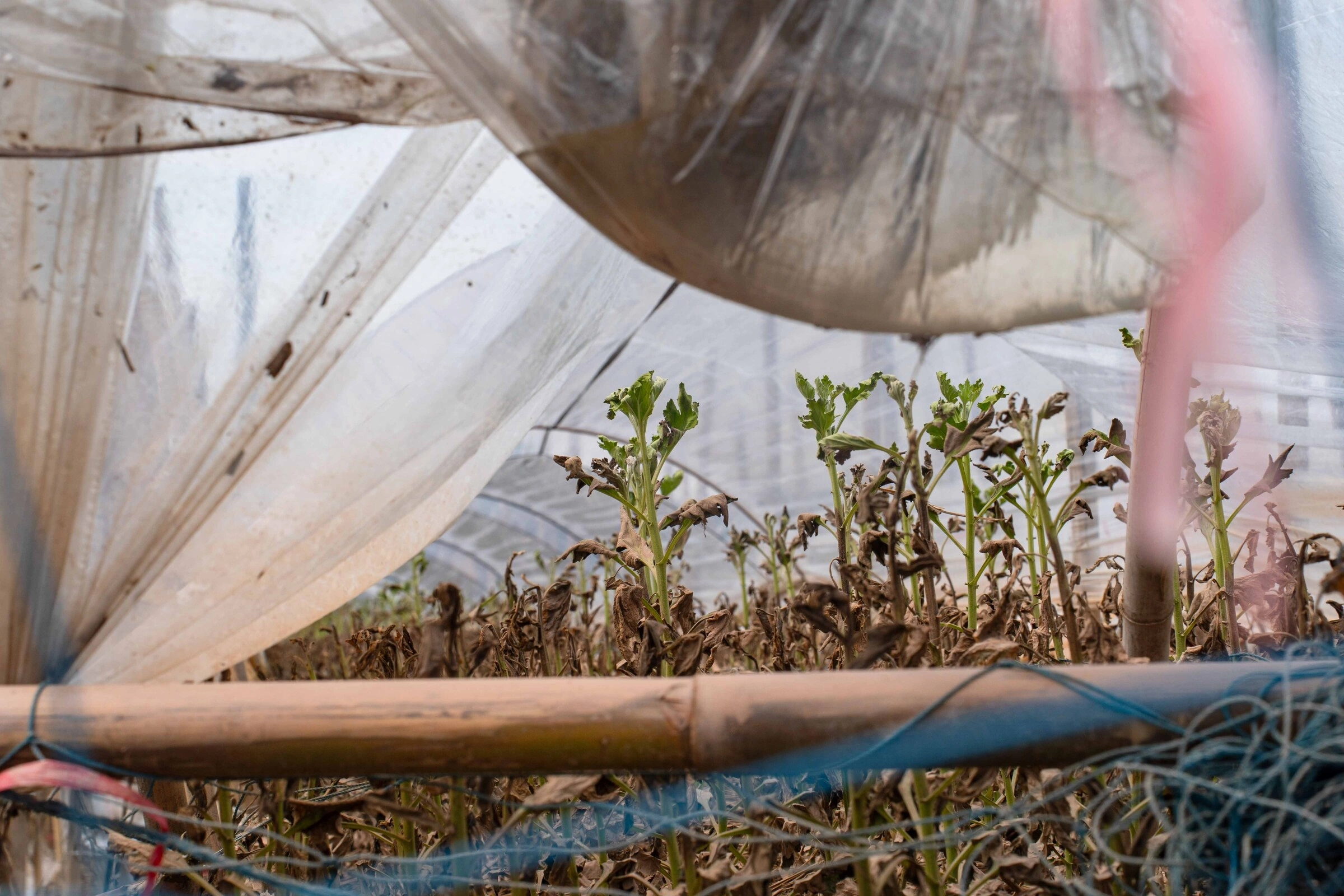 Chủ vườn tháo dỡ bạt che nắng để kiểm tra những luống cúc hoạ mi, tuy nhiên, cả vườn hoa đã bị chết úng, thân cây đổi màu.