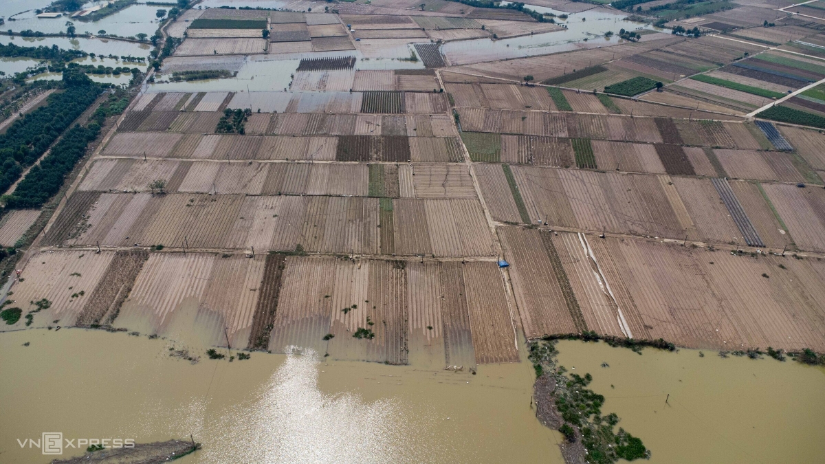 Gia đình anh Trường ở thôn Đông Cao có khoảng 3.600 m2 trồng hoa hướng dương đang vào thời kỳ nở rộ, nhưng nhiều ngày nay nước vẫn còn chưa rút hết. "Toàn bộ diện tích hoa hướng dương và rau cải mới gieo bị ngâm nước lâu ngày, thiệt hại khoảng 100 triệu đồng", anh cho hay.
