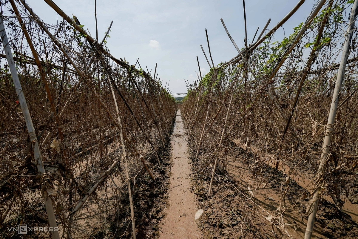 Những giàn mướp đắng, mùng tơi, dưa chuột... khô héo sau khi nước rút, để lại lớp bùn đất dày đặc trên ruộng.