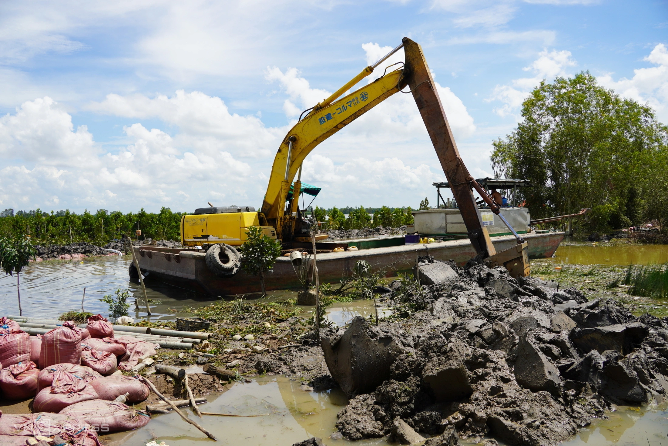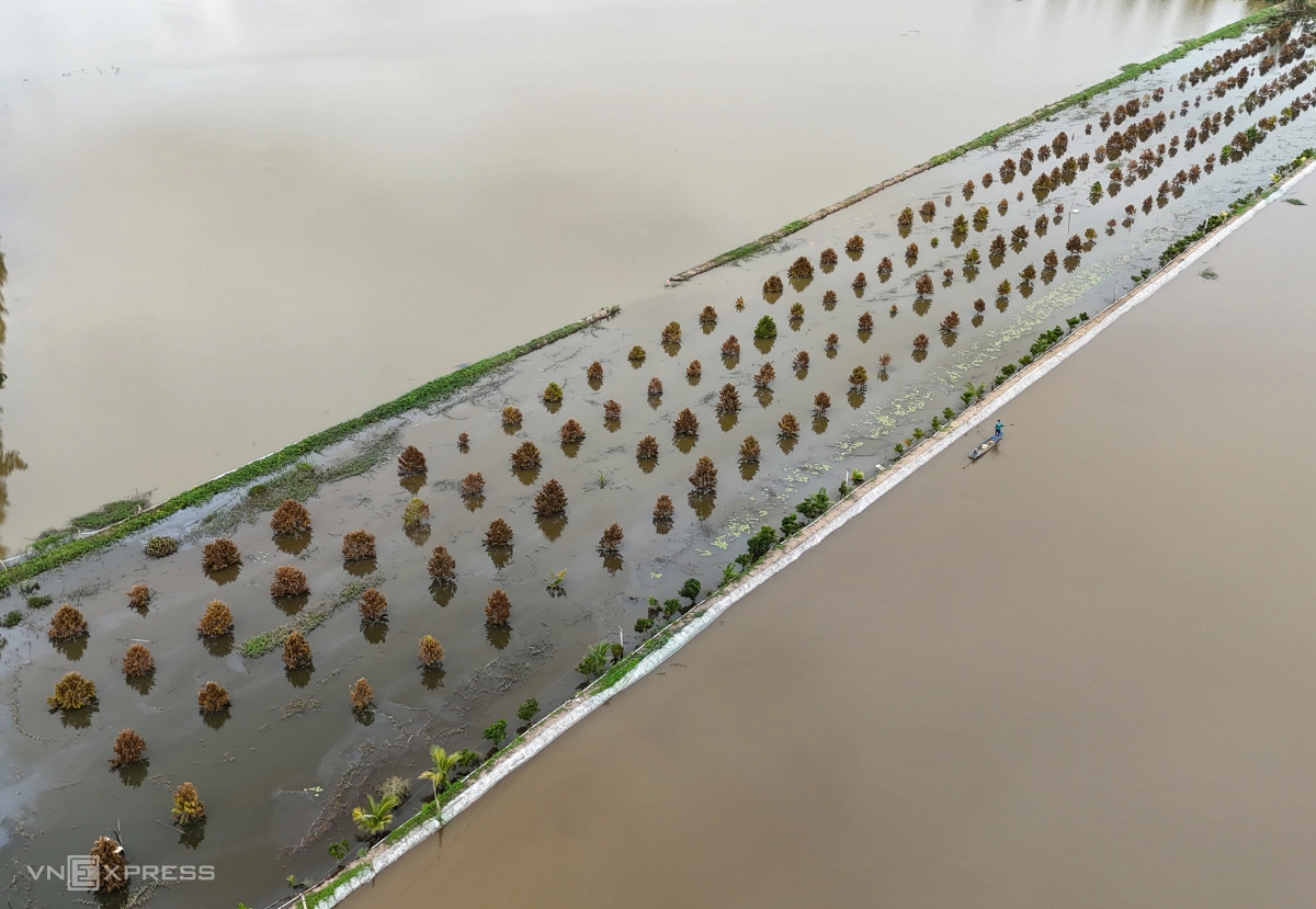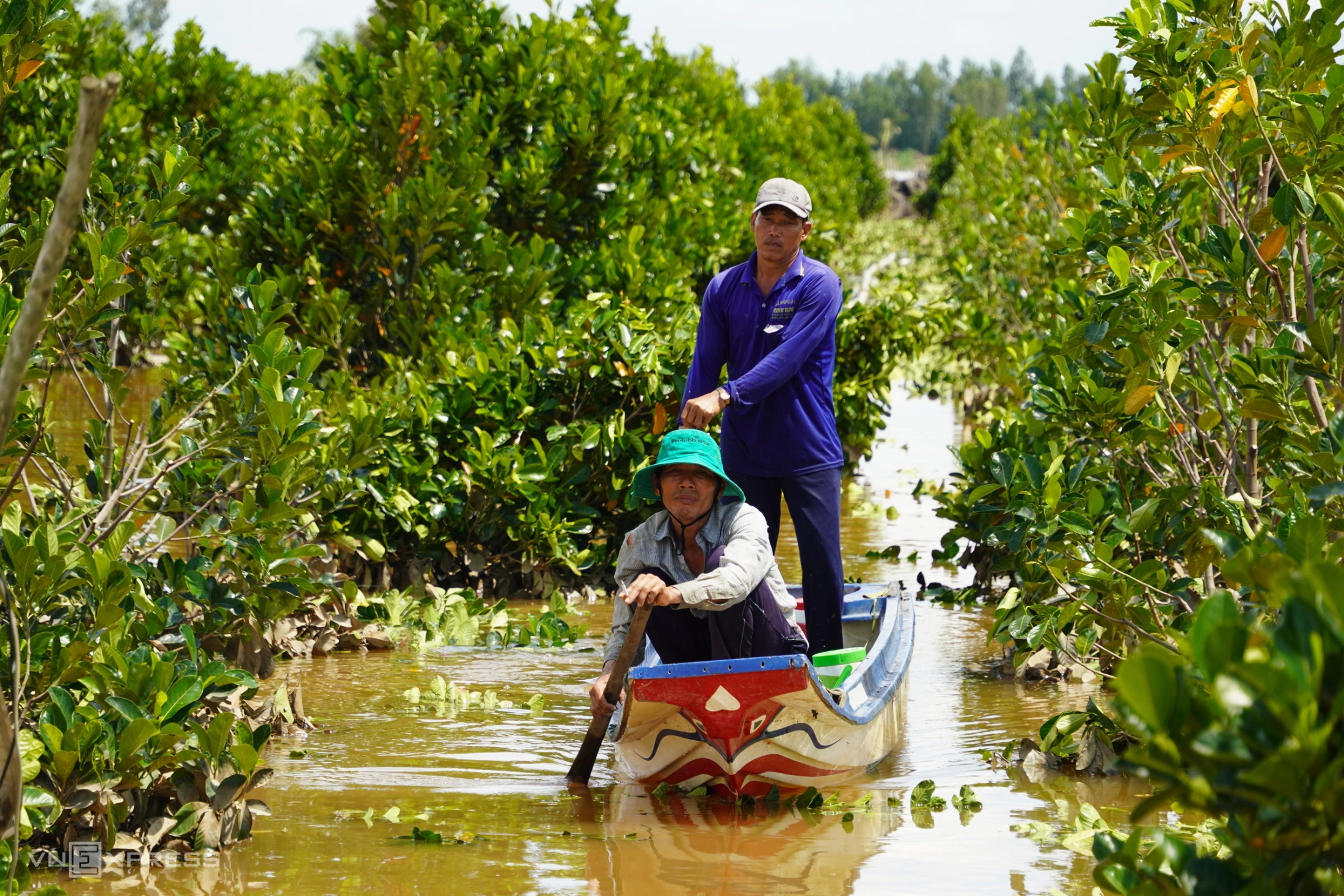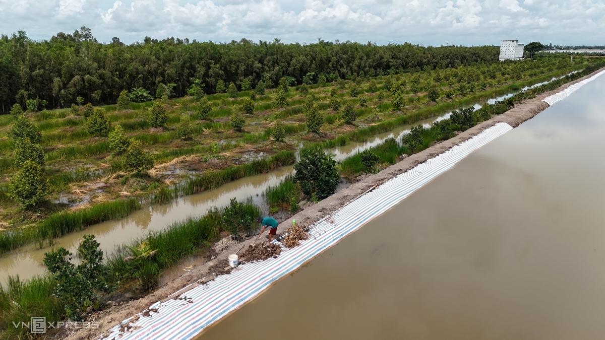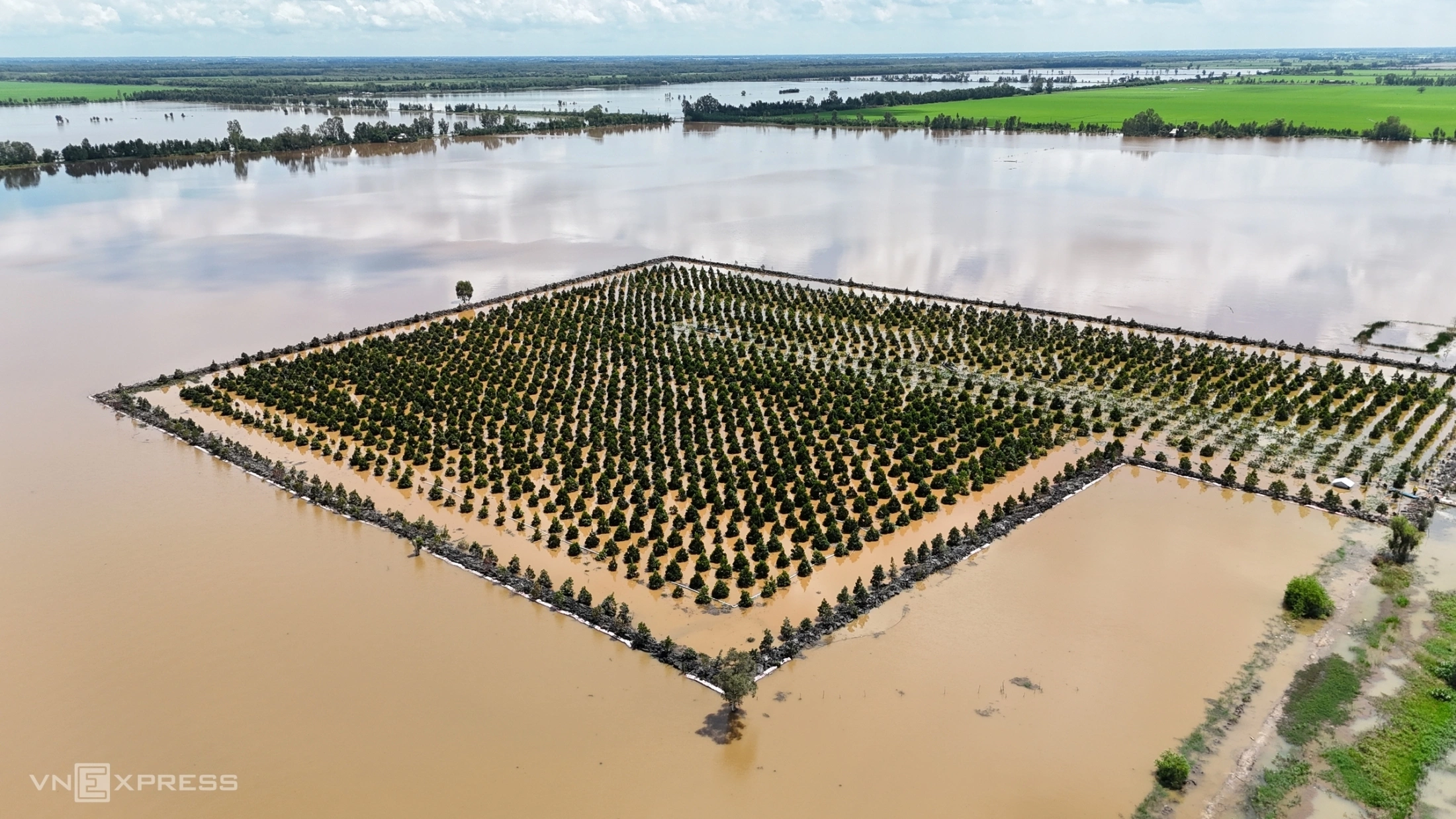 Anh Hát đã chi vài chục triệu đồng thuê nhân công gia cố đê bao bằng bạt phủ, đồng thời đặt 4 máy bơm để rút nước. Chủ vườn dự định chăm sóc thêm khoảng 2 năm nữa cây cho trái là có thể bán thu hồi vốn.