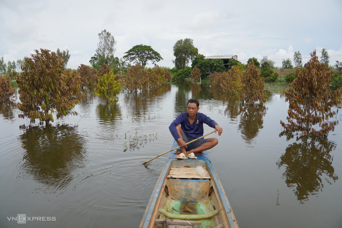 "Coi như trắng tay, chỉ biết chờ nước rút nhổ bỏ vườn cây chết để trồng cây mới. Tiền cây giống, sửa lại bờ bao cũng phải vài trăm triệu không biết xoay sở ra sao", anh Hát nói.