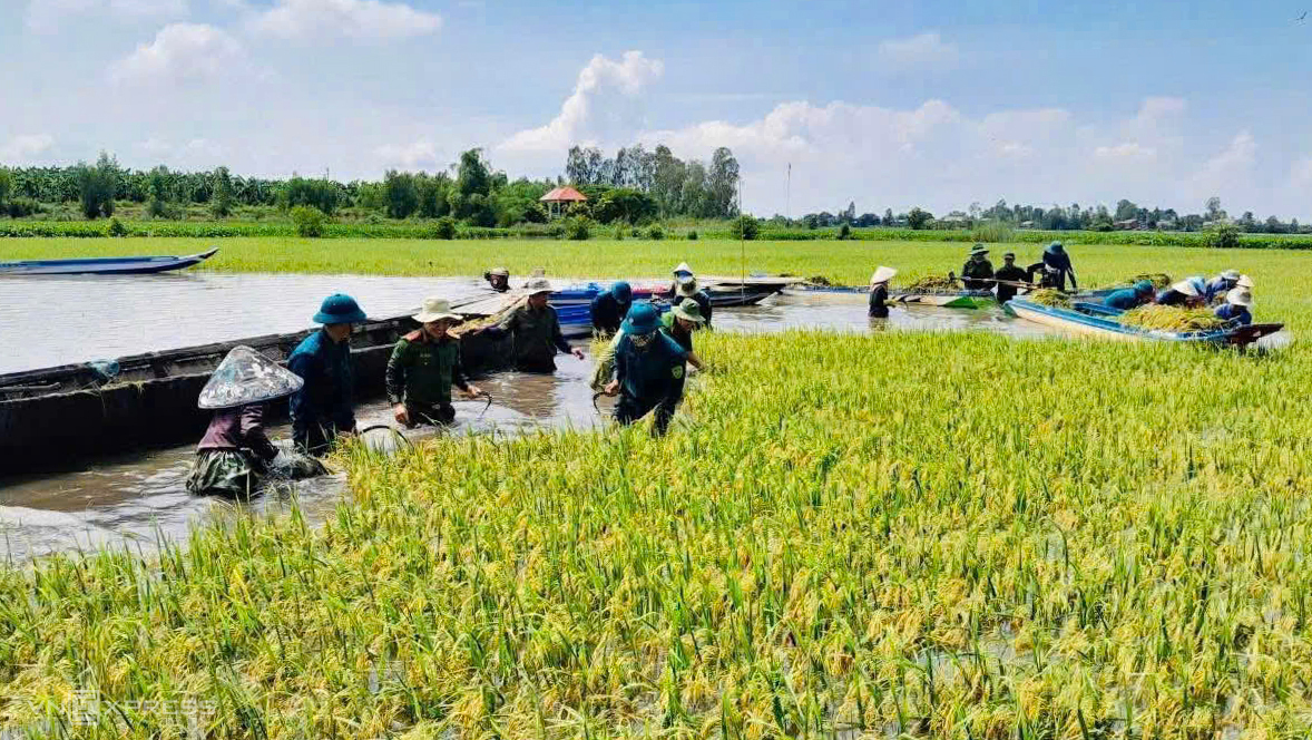 Thống kê chưa đầy đủ, lũ cao bất thường khiến hàng chục ha lúa thu đông sắp thu hoạch bị ngập. Trong ảnh là lực lượng dân quân, bộ đội lẫn công an địa phương dùng xuồng hỗ trợ người dân thu hoạch lúa.